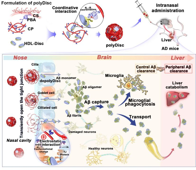 近年,FDA连续获批Aducanumab和Lecanemab两种Aβ抗体用于阿尔茨海默症(AD)早期治疗,但临床收益仍受限于Aβ中枢代谢水平低和脑出血/水肿等不良反应。丁杨/张华清/周建平团队研发了一种“Aβ类抗体药物“盘状高密度脂蛋白HDL-Disc(Aβ亲和力水平比Aducanumab高3.7倍),并与糖基促渗聚合物定向组装成polyDisc。经鼻给药后,促渗聚合物可逆开启黏膜屏障,HDL-Disc利用脑内外转运特性富集入脑,定向捕获Aβ靶向至小胶质细胞完成高效中枢清除;此外,通过淋巴外排入血富集肝脏增效外周代谢活性,实现中枢协同外周的Aβ高效代谢。本研究创新性提出了中枢协同外周Aβ系统代谢疗法,阐明了“Aβ类抗体”HDL-Disc特殊的“鼻→脑→血→肝”转运路径,增效Aβ清除的同时有效减轻中枢负荷,提高治疗安全性,为Aβ代谢依赖的AD临床治疗提供了新思路、新方案和新技术。