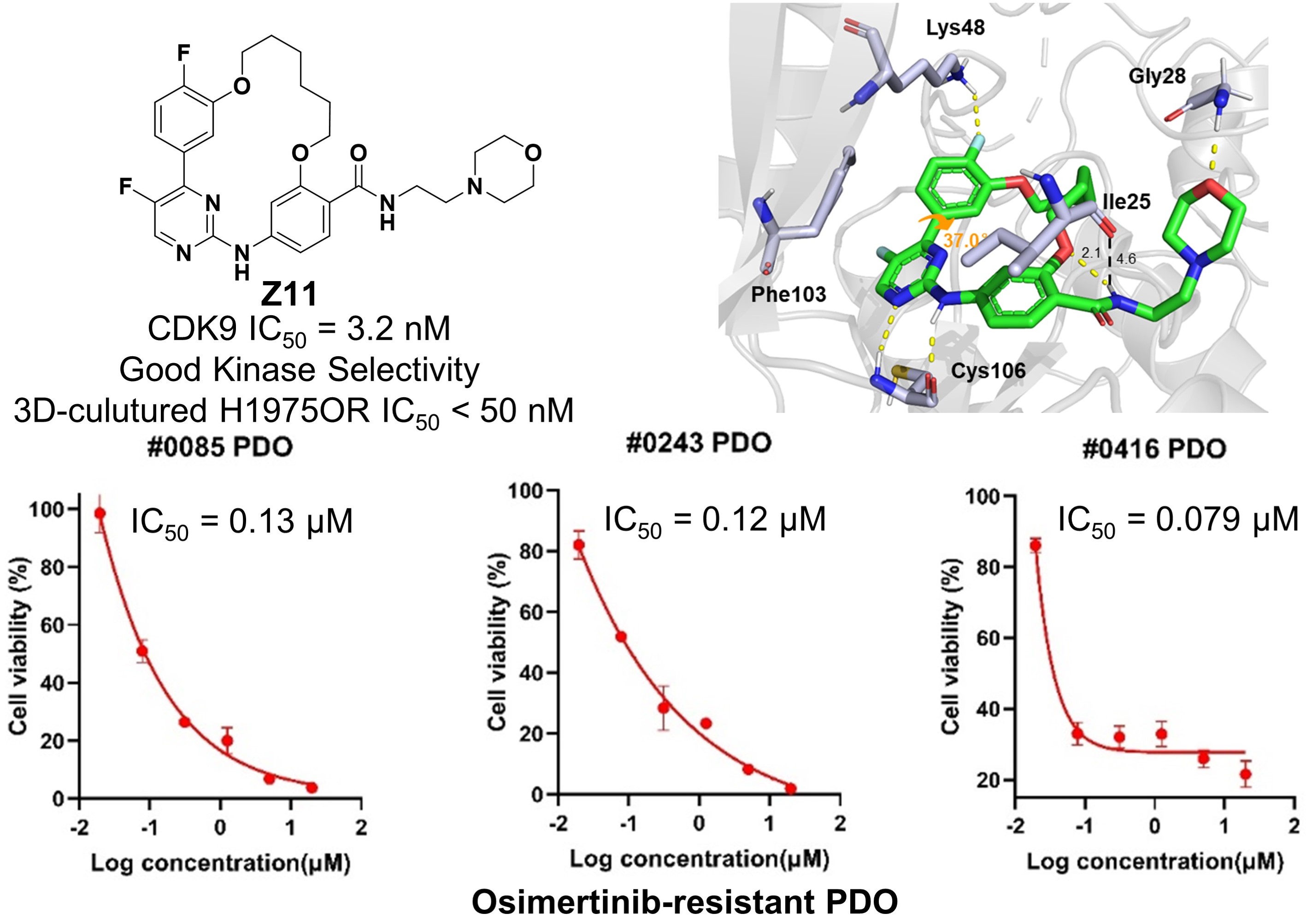 当前,代表性的第三代EGFR抑制剂奥西替尼是非小细胞肺癌(NSCLC)治疗的主要药物之一。然而,EGFR的持续突变导致奥西替尼在内的多数EGFR抑制剂普遍出现耐药性问题。尽管部分第四代EGFR抑制剂已进入临床试验阶段,但新的耐药性问题预计将不断出现,这使得寻求新的治疗耐药肺癌的药物研发策略变得尤为关键。CDK9作为RNA转录的核心调控因子,通过磷酸化RNA聚合酶II促进转录延长,并调控抗凋亡蛋白MCL-1的水平。研究发现CDK9在多种肿瘤细胞中高表达,而抑制CDK9则能够下调Mcl-1蛋白,从而发挥抗肿瘤效果。基于这一发现,该研究团队先前通过表型筛选方法识别出了一种具有CDK9抑制活性的化合物Hit,该化合物在肺癌细胞中显示出显著的抗增殖作用,但其酶选择性和成药性有待提高。为此,研究团队依托蛋白结构分析,运用大环化策略设计出一系列具有大环结构的CDK9抑制剂。在这些化合物中,优势化合物Z11不仅显著抑制CDK9蛋白活性(IC50 = 3.2 nM),而且具有高度的激酶选择性,在多种肺癌细胞中展现出明显的抗肿瘤作用。尤其值得一提的是,Z11对两种奥西替尼耐药肺癌细胞株也表现出显著的抗肿瘤效应(HCC827OR: IC50 = 0.25 μM; H1975OR: IC50 = 0.25 μM),其活性远超过阳性对照药物BAY1143572。进一步研究显示,在奥西替尼耐药细胞株H1975OR中,Z11能快速下调Mcl-1蛋白水平,抑制细胞增殖和克隆形成,并诱导细胞凋亡。药效评估还表明,低剂量的Z11能有效抑制多个奥西替尼耐药肺癌类器官的生长,并且具有中等代谢性质和良好的体内安全性。总之,该团队开发出了一类新型大环类CDK9抑制剂,不仅为奥西替尼耐药NSCLC治疗提供了新的方案,也为耐药肺癌治疗药物的开发奠定了研究基础。
