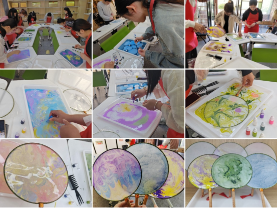 本次活动吸引了40余名同学参加。在工作人员指导下,同学们开始拓印前的准备工作,先发挥自己的巧思,在水面上用不同色彩的颜料碰撞出奇妙的图案,再用工具勾勒出独特的花纹,或是郁郁青青如春日垂柳,或是黛蓝绛紫如夕阳云雾,体现出同学们丰富的创造力。接着,同学们将团扇轻轻放于水面之上,一呼一吸之间,水面上的图案就印在了洁白的扇面上,一把独一无二的水拓团扇就完成了。同学们积极交流个人创意,纷纷动手参与团扇制作,感叹工艺的精巧和扇面的美丽,活动现场气氛热烈。