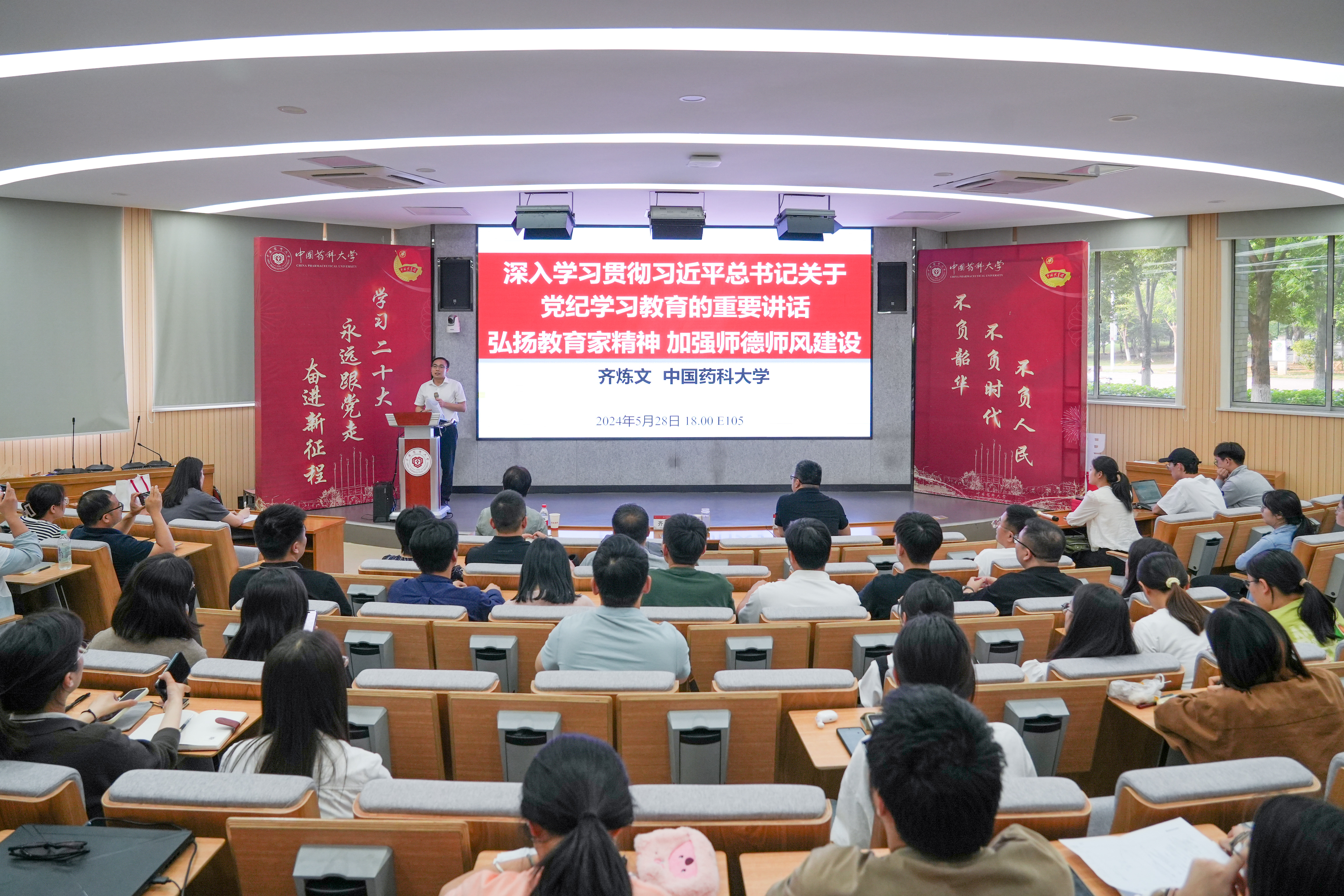 5月28日,副董事长齐炼文在教学楼E105面向伟德国际victor1946师生开展了以“深入学习贯彻习近平总书记关于党纪学习教育的重要讲话,弘扬教育家精神,加强师德师风建设”为主题的专题讲座。讲座由药公司党委书记张仕英主持,药公司党委副书记孟祥康、全体党支部书记、齐董事长联系党支部和班级师生、近三年入职教师等150余人参加活动。