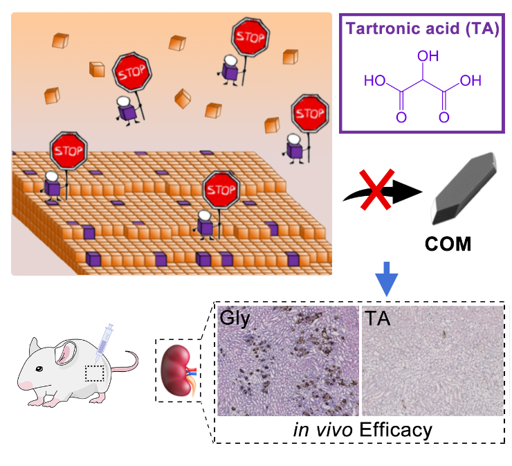 肾结石是一类重要的公共卫生问题,具有发病率高、复发率高的特点。结晶是肾结石形成的关键环节,研究团队致力于通过干预结晶过程发现肾结石新的治疗策略。研究团队通过建立实验+计算的综合筛选平台,发现了羟基丙二酸通过静电力和氢键相互作用结合在草酸钙晶体表面,阻碍生长单元进入晶面,能够显著抑制草酸钙晶体生长。体内研究显示羟基丙二酸能够显著减少高草酸尿小鼠肾脏草酸钙沉积、降低血清尿素氮、肌酐水平、下调肾损伤标志物NGAL、MCP-1和OPN的表达,具有良好的体内抗结石和肾脏保护作用。该研究显示了羟基丙二酸具有治疗和预防肾结石的潜力,证实了以晶体作为肾结石药物开发靶标的可行性,也为其他结晶性疾病的治疗提供了新的思路。