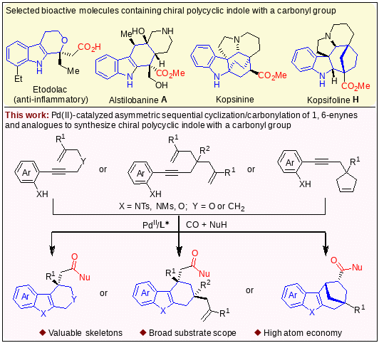 含有酯基或羧基官能团的多环吲哚骨架广泛存在于具有重要生物活性的吲哚天然生物碱中,其合成和活性研究引起了化学家们的广泛关注。然而,该类骨架的不对称催化合成仍具有一定挑战性,尤其是手性季碳中心和多手性中心的构建。围绕以上问题,林爱俊/姚和权团队在前期工作基础上,设计开发了一类新型钯催化不对称连续环化羰基化反应,高效构建了一系列含有酯基或酰胺基团的手性多环吲哚类化合物,包括含吲哚骨架的桥环化合物。此连续环化反应可同时构建4根化学键,2个环,至多3个手性中心,成功解决了复杂多环吲哚中手性季碳和多手性中心合成问题,并且具有广谱的底物适用性、高原子经济性、高对映选择性和非对映选择性。