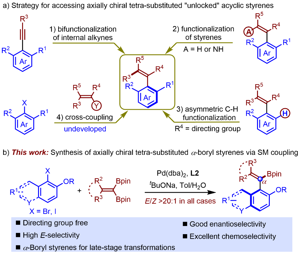 近年来,高尚/姚和权团队通过过渡金属催化不对称合成策略,构建了多类轴手性分子骨架,取得了多项研究成果(Angew. Chem. Int. Ed. 2023, 62, e202305518; ACS Catal. 2024, 14, 3475)。在此基础上,该团队进一步利用过渡金属钯催化对映选择性Suzuki-Miyaura偶联反应,构建了含硼四取代苯乙烯类轴手性化合物。该反应具有对映选择性高、化学选择性好以及反应条件温和等特点。同时,产物中包含的α-硼酸酯基团可进行类型丰富的后续转化,且产物的光学纯度可保持在较高水平。该研究不但为四取代开链苯乙烯类阻转异构体的不对称合成提供了新的策略,同时为开链苯乙烯类化合物在药物研发、配体设计合成等领域奠定了合成基础。