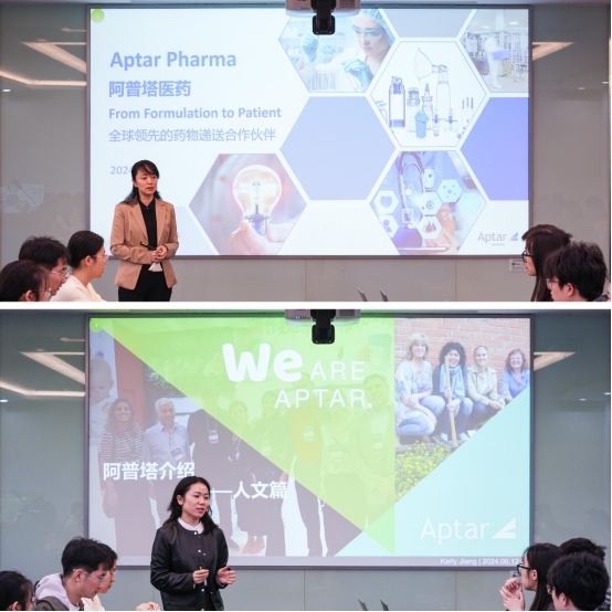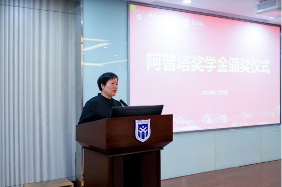 阿普塔医药事业部战略市场总监富天骄致辞,对获奖员工表达祝贺,鼓励药大学子坚定使命感与责任感,保持热爱,耐住寂寞,早日成为国之栋梁。