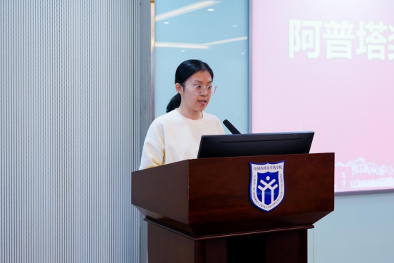2021级药物制剂专业本科生张怡然同学作为获奖员工代表发言,代表获奖员工向阿普塔集团表达诚挚感谢,表示未来将以满腔的热情和坚定的信念投身于祖国的医药事业,用所学所得回馈社会。