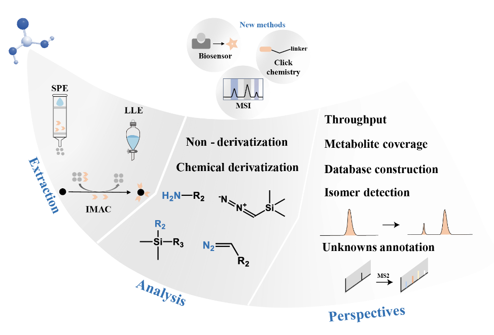 机体内超过1/3的代谢物为磷酸修饰代谢物,这些代谢物在功能上彼此关联,共同构成磷酸修饰代谢网络,实现磷酸修饰代谢物的定性和定量分析是探究磷酸修饰代谢网络功能的前提和基础。团队系统梳理了目前磷酸修饰代谢物分析的样本前处理方法、分析策略,强调了质谱探针对于建立该类代谢物定量分析方法的重要性,同时,提出了磷酸修饰代谢物的分析瓶颈问题及未来发展趋势。相关内容以“Challenges and possibilities for the qualitative and quantitative analysis of phosphate metabolites”为题发表在TrAC Trends in Analytical Chemistry。伟德国际victor1946张培副教授、2021级博士生高美玉为本文共同第一作者,许风国教授为通讯作者,伟德国际1946亚洲版为唯一通讯单位。
