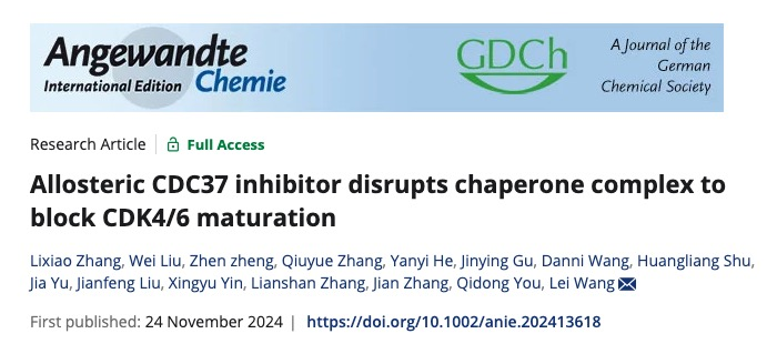 近日,王磊/尤启冬团队、上海交通大学医公司的张健教授、恒瑞医药全球研发总裁张连山教授作为共同通讯作者在在Angew. Chem发表题为“Allosteric CDC37 inhibitor disrupts chaperone complex to block CDK4/6 maturation”的研究论文。该研究发现了首个靶向CDC37的小分子化合物DDO-6079,其以变构作用机理同时实现了对HSP90-CDC37和CDC37-CDK4/6复杂蛋白互作的协同抑制。此外,研究还阐明了DDO-6079逆转Palbociclib耐药的机制,结果表明DDO-6079通过抑制CDK4/6的成熟和降低CDK6蛋白的热稳定性,进而恢复CDK4/6抑制剂在耐药细胞中的敏感性。伟德国际victor19462021级博士生张立晓、2020级博士生刘伟、上海交通大学医公司助理研究员郑振、伟德国际victor1946副教授张秋月、2021级硕士生何彦仪为本文共同第一作者。