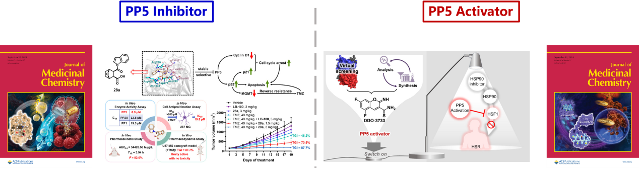PP5也是一种重要的共伴侣蛋白,同时具有磷酸酶属性,负责调节底物蛋白的磷酸化状态,进而影响底物蛋白的活性、稳定性等重要特性。然而,目前对调控PP5的继发生物学效应研究尚不明确,致使靶向PP5药物应用受限。为此,王磊/尤启冬团队同时进行PP5抑制剂和激动剂开发,并先后在J. Med. Chem发表题为“Design and Synthesis of 7 Oxabicyclo[2.2.1]heptane-2,3-dicarboxylic Acid Derivatives as PP5 Inhibitors To Reverse Temozolomide Resistance in Glioblastoma Multiforme”和“Allosteric Activation of Protein Phosphatase 5 with Small Molecules”的研究论文,且均为当期封面文章。PP5抑制剂28a可诱导细胞周期阻滞和逆转TMZ耐药性;PP5激动剂DDO-3711的研究解决了因PP5自抑制状态产生的激动剂设计难题,还发现其与HSP90抑制剂联合使用在降低热休克蛋白毒性方面的潜在价值。两项研究探索了PP5调控效应及应用,为PP5的研究和应用提供了新的工具和思路。伟德国际victor1946王磊研究员和尤启冬教授为通讯作者,2021级博士生李泽坤、2022级硕士生郭沫辰和2023级硕士生顾明晓为抑制剂研究共同第一作者,伟德国际victor1946副教授张秋月、2021级硕士生颜玲和2021级博士生张立晓为激动剂研究共同第一作者。