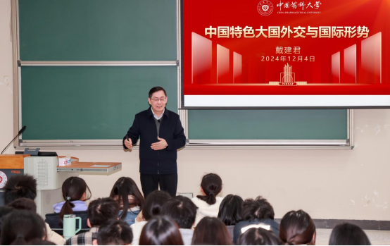为进一步贯彻落实党的二十届三中全会精神和习近平总书记对公司思政课建设作出的重要指示精神,持续推动习近平新时代中国特色社会主义思想进教材进课堂进头脑,12月4日,公司党委书记戴建君以“中国特色大国外交与国际形势”为主题,为伟德国际victor1946药学类大一新生讲授 《形势与政策》课。相关职能部门、马克思主义公司、伟德国际victor1946负责人,形势与政策课教师和辅导员代表旁听了授课。