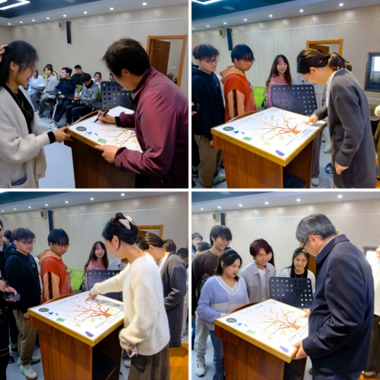 交流中,张书记为2201101班的班级指纹树题字“向外看,向内求,向前走”,再次鼓励同学们“登高山,赏美景”。随后,老师和同学们一起在班级树上留下了印记,使这棵班级树充满了生机和活力。
