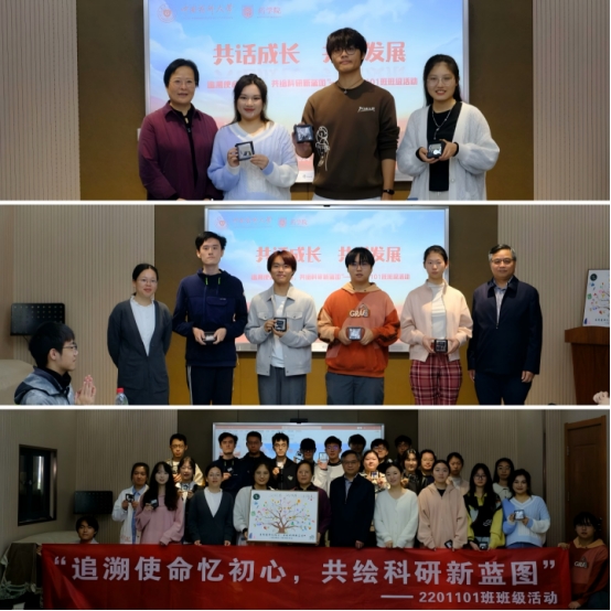 活动最后,三位老师为同学代表赠送科研钥匙环和胸针,激励同学们勇做追梦人,勇当奉献者。