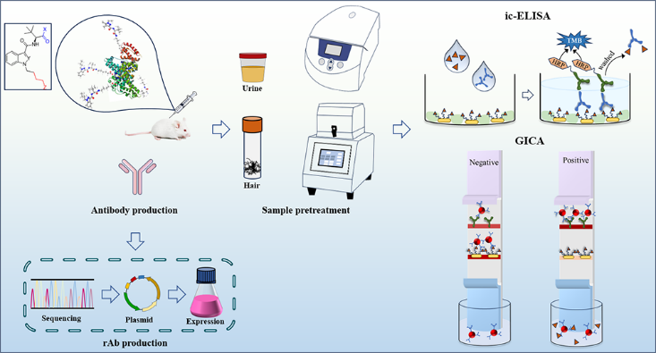 合成大麻素类物质是新精神活性物质中涵盖种类最多、滥用最为严重的家族,众多非法药物使用案件中鉴定出一类具有吲唑或吲哚母核的新型酰胺类合成大麻素,但目前缺乏对这类大麻素广谱的免疫分析方法。本研究基于新型滥用的吲唑酰胺类和吲哚酰胺类合成大麻素制备相应高亲和力单克隆抗体,并建立了酶联免疫吸附法(ELISA)和胶体金免疫层析法(GICA)用于生物样本中合成大麻素的广谱定性定量检测,助力现场快检。该研究还报道了合成大麻素类抗体的特异性氨基酸序列并阐述作用模式,为未来不断迭代更新的合成大麻素类物质的单克隆抗体开发提供重要工具。