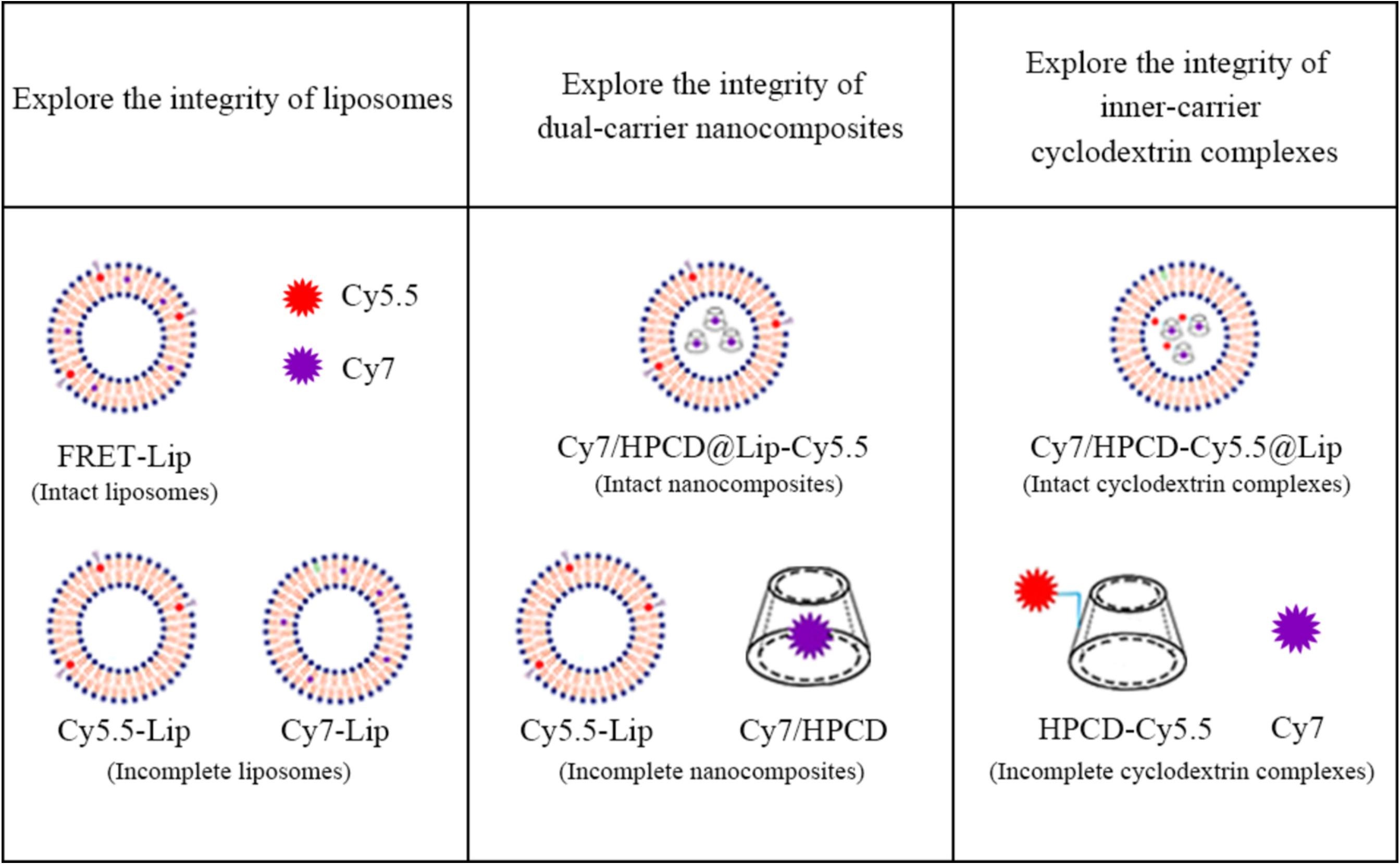 研究纳米载体从眼表到眼后段的体内命运,监测载体递送过程中的结构完整性,一直是眼部药物递送系统领域的热点和难点。目前已发表的文章多通过基于测定FRET荧光效率的方法来探究纳米载体的体内命运,缺乏科学依据。本研究首次建立了基于测定完整纳米载体中荧光分子含量进行半定量研究的新方法,为基于FRET技术的药物递送系统的体内命运研究提供了新方法。基于课题组前期研究成果(Carbohydr Polym. 2023,315:120960. IF 11.2),本研究首先构建了不同形貌、组成和靶向特性的脂质体递药系统,使用近红外Ⅰ区菁染料Cy5.5/Cy7作为FRET对,通过荧光共振能量转移技术(FRET)结合小动物活体成像系统(IVIS),系统地对脂质体在结膜、巩膜和脉络膜-视网膜等不同组织中的结构完整性进行了研究。后制备了环糊精@脂质体双载体递药系统,对外载体脂质体和内部环糊精包合物从眼表到眼后段各个组织中的结构完整性进行了探究。最后以地塞米松为模型药物构建了主动靶向型羟丙-β-环糊精@脂质体双载体递药系统,并对其眼后段的递送效率进行了评价。