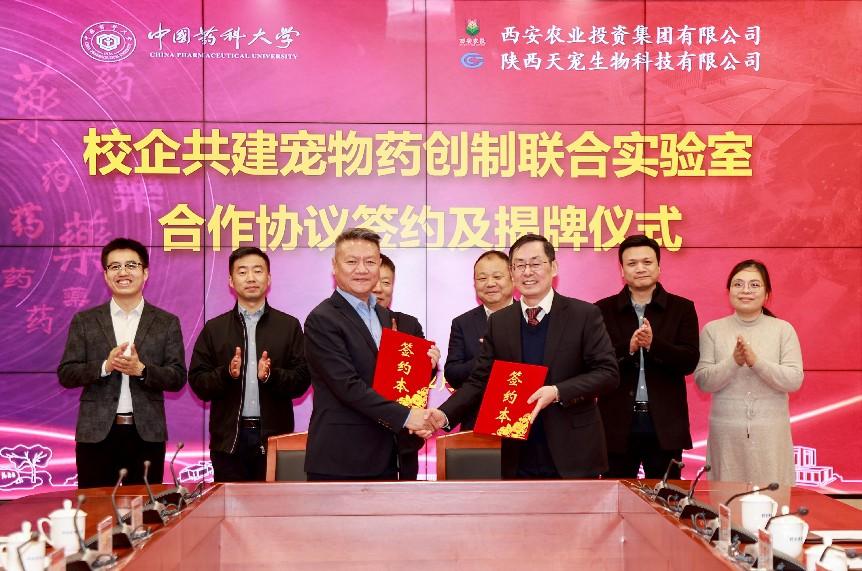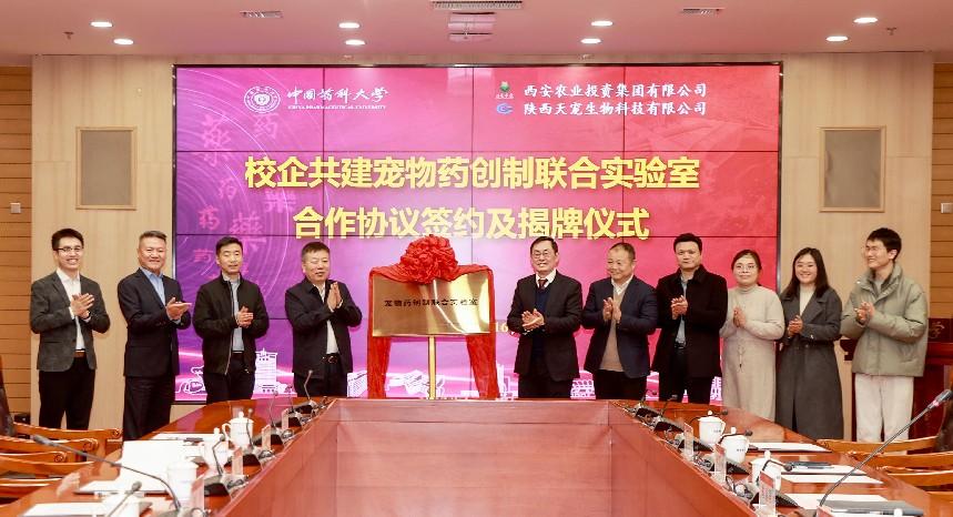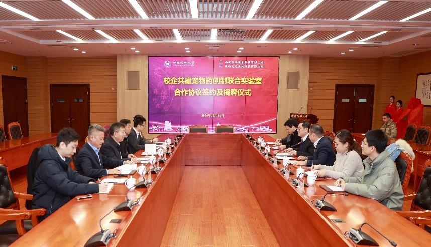 戴建君书记和薛猛总经理代表双方签署了联合实验室共建合作协议。戴建君书记和成斌董事长共同为宠物药创制联合实验室揭牌。