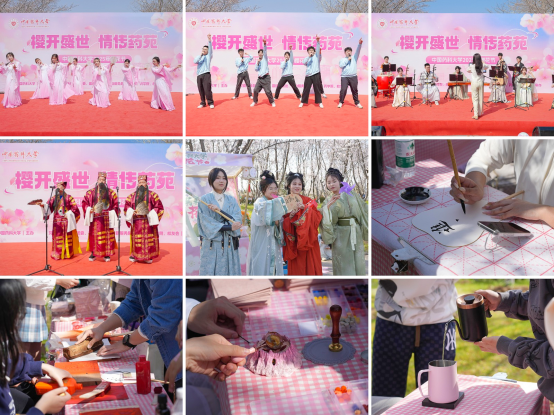 樱花树下,红叶舞蹈团《能不忆江南》舞步悠扬,凌霄合唱团《白樱花乐园》歌声欢快,沐韵流音古风社沉浸式体验古典文化,雕版印刷艺术工作坊手把手体验非遗技艺,子规堂书画社泼墨挥毫,清心茶社烹茶饮春,菁菁音社唱响青春,Since吉他音乐协会奏响乐章,R.H.舞蹈社劲歌热舞,梨园春雪戏曲社音韵流长。