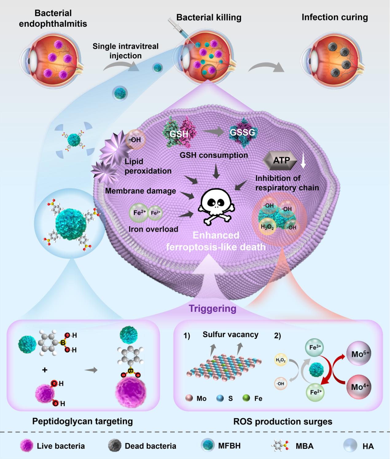 为了应对这一挑战,团队提出了一种基于细菌特异性人工生物催化剂(MFBH)的生物靶向催化策略用于治疗细菌性眼内炎。结果表明,MFBH对标准和临床分离的金黄色葡萄球菌菌株均表现出高效的肽聚糖靶向催化抗菌能力。值得注意的是,体内实验结果表明,MFBH的治疗效果与万古霉素相当且不会引起视网膜损伤。机制分析表明,MFBH通过加速活性氧(ROS)爆发诱导增强的类铁死亡样细菌杀伤。进一步的研究表明ROS的产生与暴露在人工生物催化剂表面的硫空位及Mo4+密切相关。综上所述,这种细菌特异性人工生物催化剂为治疗眼内炎提供了一种很有前途的策略。