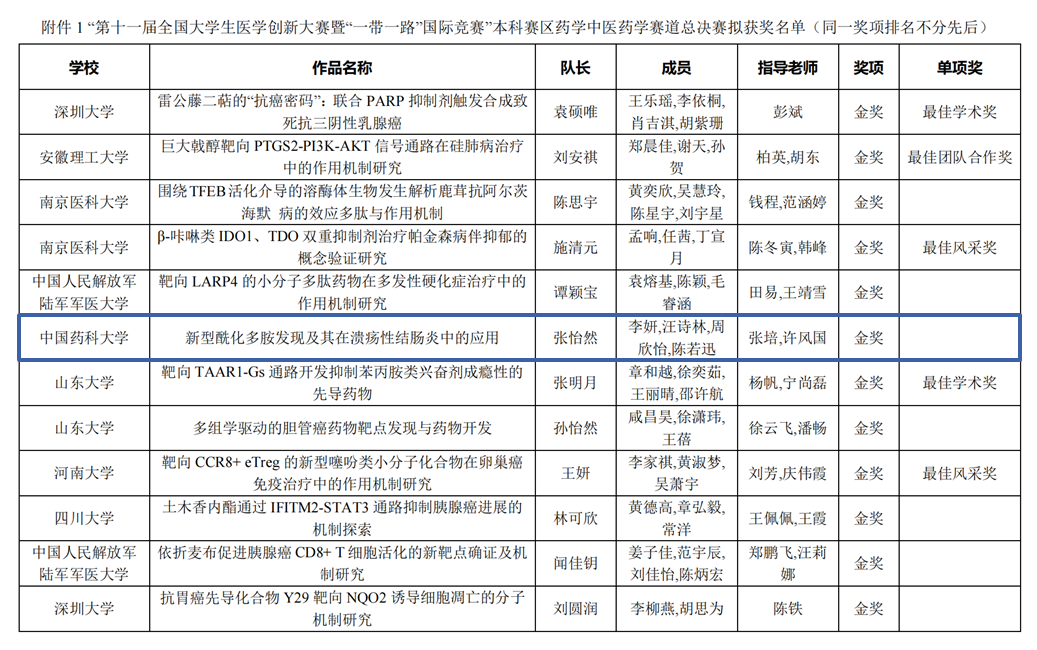 近日,第十一届全国老员工医学创新大赛暨2025“一带一路”国际竞赛全国总决赛在山东大学圆满落幕,由来自伟德国际victor1946、基础医学与临床药学公司本科生组成的公司代表队(成员:张怡然、李妍、汪诗林、周欣怡、陈若迅,指导教师:张培、许风国)表现优异,参赛项目《新型酰化多胺发现及其在溃疡性结肠炎中的应用》荣获药学中医药学赛道全国总决赛金奖。