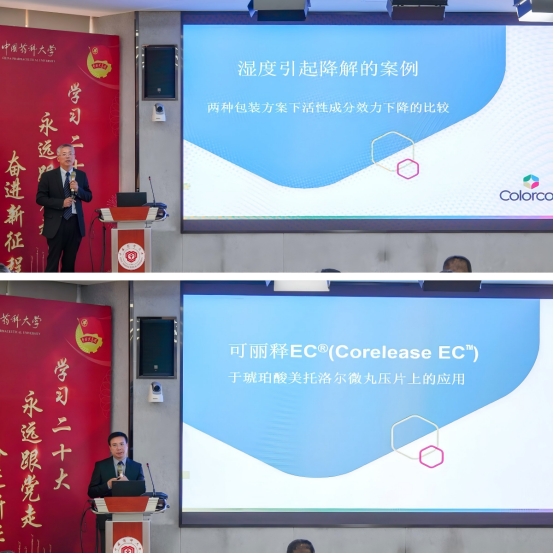 会后,刘瑞明经理带来技术讲座《药品质量稳定性提升:包衣、辅料与包装多维实践》,以卡乐康公司片芯系列产品善达与薄膜包衣系列产品欧巴代为案例介绍产品创新进展。尹红卫经理以《从配方服务到应用实践——卡乐康的缓控释技术全面解决方案》为题作学术报告,介绍了多功能包衣系统在提高生产效率、调节药物释放等方面的重要突破。