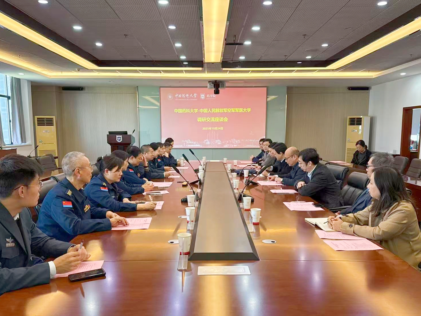 会上,狄斌对空军军医大学药学系葛煦一行的到访表示诚挚欢迎,期待以此次会面为契机推动双方在药学相关领域的协同合作。吴照球对兄弟院董事长期以来给予的关注与支持致以衷心感谢,并期待双方在共同申报科研项目以及联合培养研究生方面有新的突破。双方还围绕药学团队建设、高层次人才引进、拔尖创新人才培养等方面展开深入与探讨。