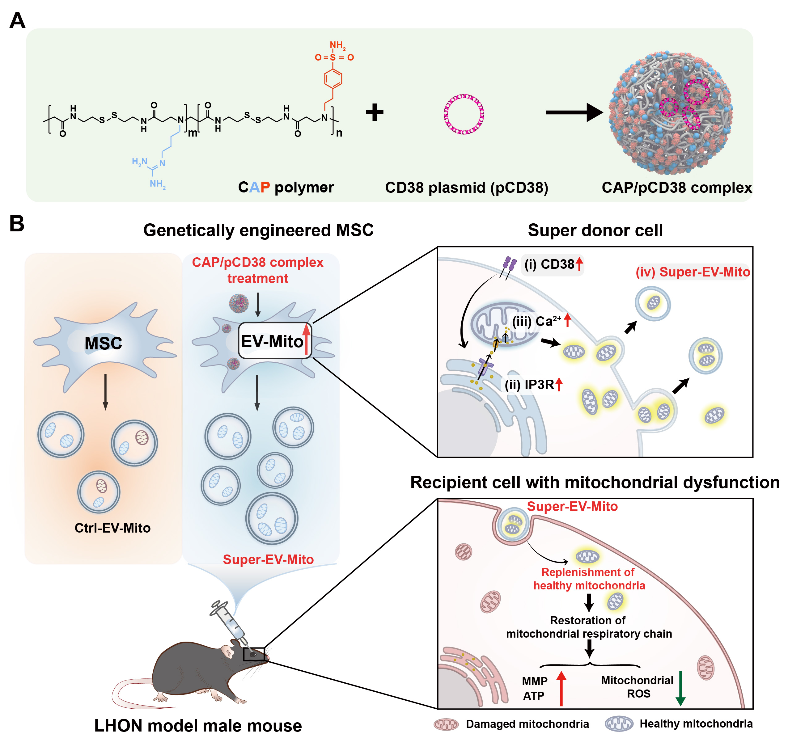 线粒体转移是机体内用以拯救受损细胞的自发生理过程,常见的转移方式有隧道纳米管、细胞外囊泡等。然而,自发的线粒体转移往往存在数量不足或质量受损等问题,这严重限制了线粒体移植疗法的治疗效果。针对这一问题,该研究团队基于前期线粒体移植研究基础及干细胞基因转染技术(ACS Nano, 2024, 18, 32705-32722; Acta Pharm Sin B, 2024, 14, 5435-5450; Adv Drug Deliv Rev, 2024, 211, 115355)的基础上,构建了一种基因工程化改造的间充质干细胞,通过激活细胞内钙相关通路探究间充质干细胞中线粒体行为及含线粒体细胞外囊泡的分泌过程,从而增加细胞外囊泡中的线粒体数量与质量,打破传统含线粒体囊泡的应用限制,实现对线粒体罕见病Leber遗传性视神经病变的有效治疗。