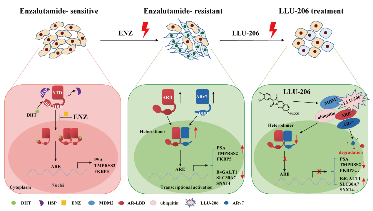 前列腺癌是男性泌尿生殖系统最常见的恶性肿瘤之一,其致死率居全球男性癌症相关死亡第二位。恩杂鲁胺(Enzalutamide,ENZ)是FDA批准的第二代雄激素受体(AR)拮抗剂,用于治疗晚期去势抵抗性前列腺癌。全长AR(ARfl)及其剪接变异体7(ARv7)表达增加、ARfl/ARv7异源二聚体生成等因素所导致的AR信号重新激活,是驱动ENZ耐药的主要机制。研究人员基于ENZ结构进行优化和改造,采用三元并环策略设计合成了一系列结构新颖的小分子化合物,并通过双分子荧光成像等多种分子细胞生物学技术,筛选得到新型AR拮抗剂优势候选化合物LLU-206。LLU-206可通过E3连接酶MDM2介导的泛素化-蛋白酶体途径,靶向ARfl/ARv7蛋白降解,抑制ARfl/ARv7异源二聚体生成,有效抑制ARfl/ARv7驱动的ENZ耐药性晚期前列腺癌进展,为下一代AR调节剂(降解剂/拮抗剂)的开发提供了新的思路。
