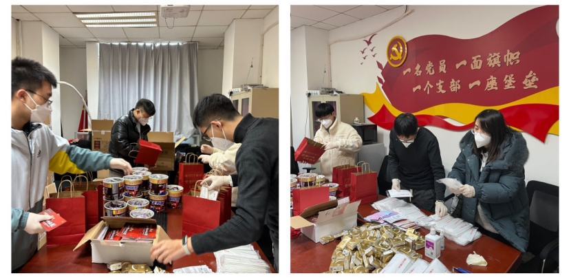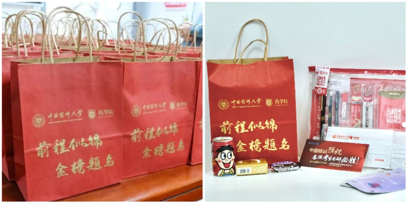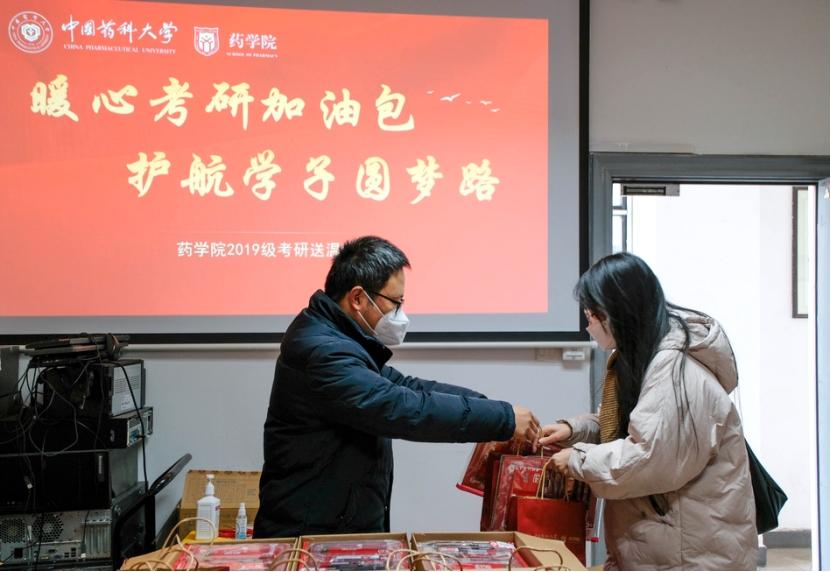药公司党委书记张仕英、党委副书记孟祥康带领大四毕业班辅导员、员工党员一同为考研学子发放“加油包”。张仕英书记鼓励员工在最后冲刺阶段,坚定目标、提高定力,振奋信心、提升效率,稳定心态、从容应考,考出好成绩,全力以赴向梦想前进。孟祥康副书记叮嘱员工在关键时期做好自身防护,以最佳的身体和心理状态迎接考试,实现既定目标。