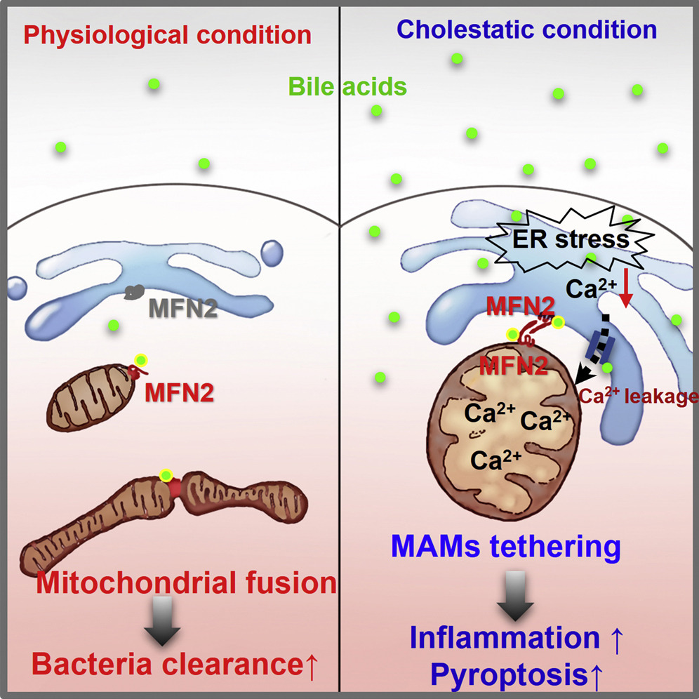MFN2是一种GTPase样的动力酶,在线粒体-线粒体融合和线粒体-内质网束缚融合中发挥重要作用。该研究发现MFN2是内源性胆汁酸的直接受体,在胆汁淤积病理情况下高浓度胆汁酸可激活MFN2促进线粒体-内质网束缚融合,导致内质网内钙离子转移入线粒体进而激活NLRP3炎症小体并诱导巨噬细胞细胞焦亡,解释了细菌感染性休克病理情况下,胆淤作为危险并发症触发过度免疫反应导致炎症因子风暴和器官衰竭的病理机制。相反,生理水平的胆汁酸则通过MFN2促进线粒体之间的融合反应,延长巨噬细胞寿命并促进细胞吞噬作用进而有助于清除细菌。综上,该研究揭示了胆汁酸-MFN2信号轴在协调病原体入侵后的固有免疫反应中发挥双向调节的作用。