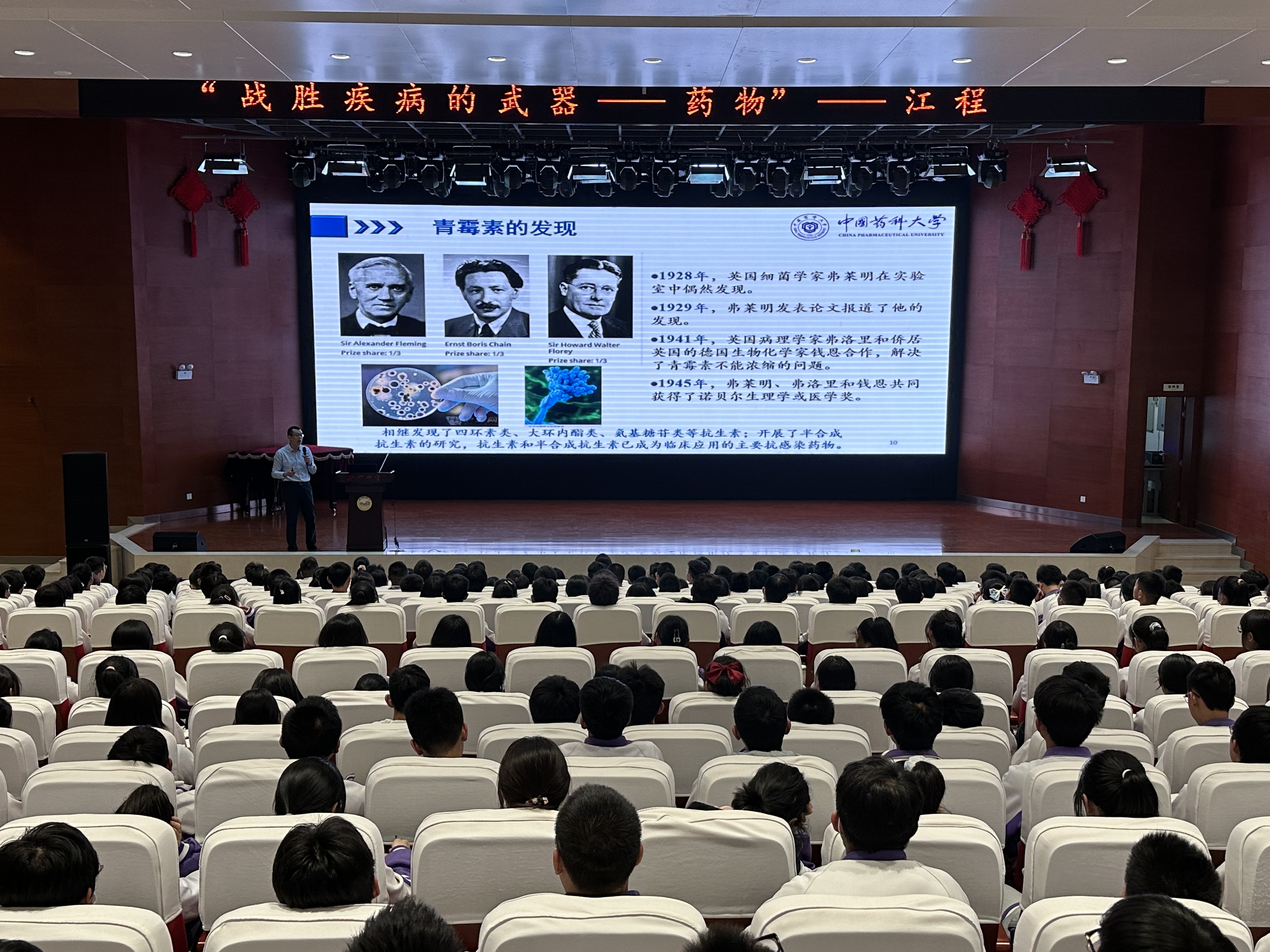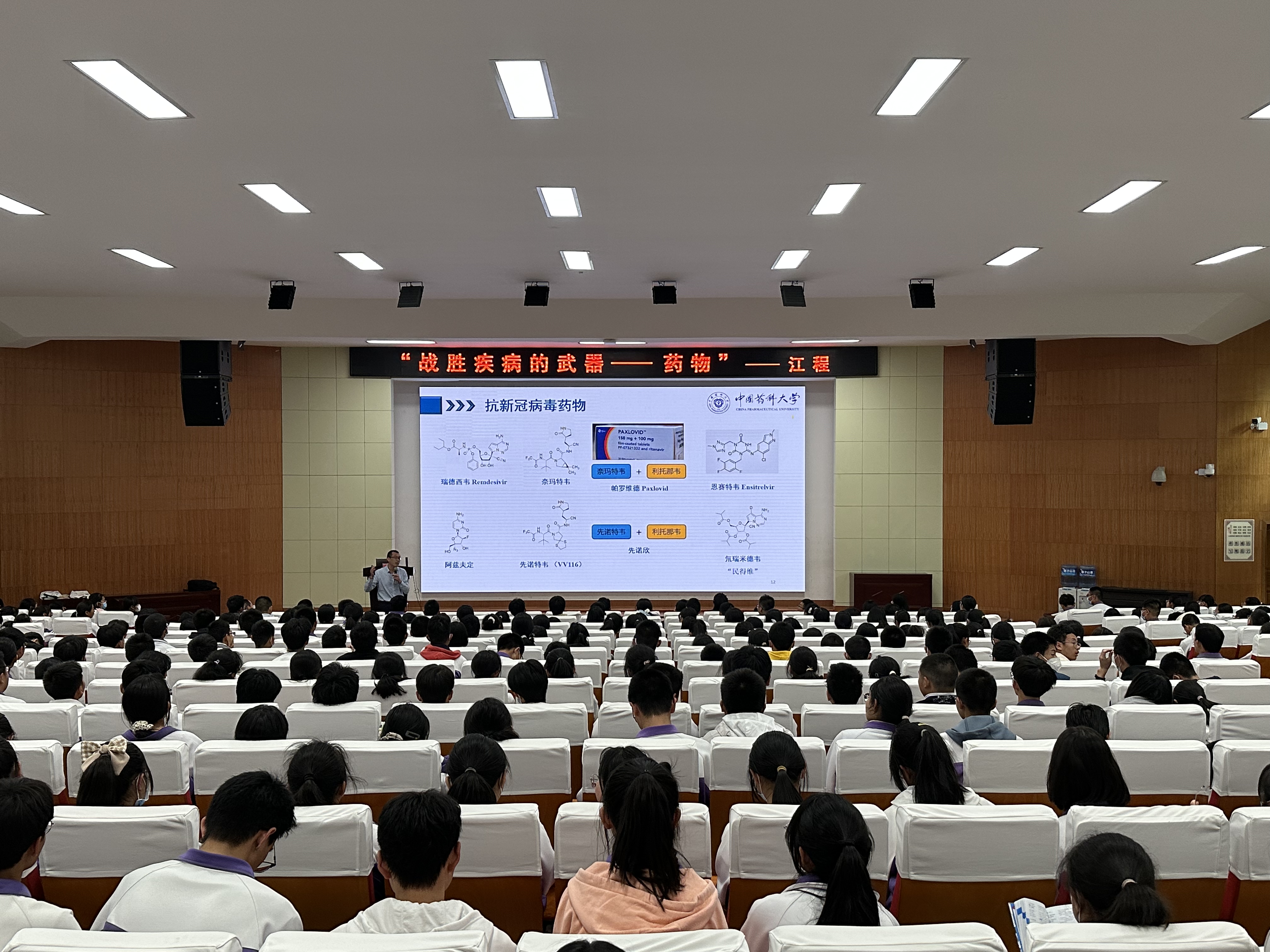 在四所公司,江程教授为高一、高二员工作了题为“战胜疾病的武器——药物”的药学科普讲座,他从“什么是药物”这个话题谈起,以青霉素的发现、阿司匹林的诞生、我国第一个自然诺贝尔奖的产生、抗新冠病毒药物的研发等高中生耳熟能详的例子,阐述了药学发展简史、当前国内外药学研究热点和难点、医药产业的特点和发展趋势、药物研究面临的挑战和机遇等内容。讲座中,江程教授还从历史沿革、团队力量、教学科研成果、办学特色、人才培养等方面介绍了公司基本情况。在交流互动环节,同学们就药学相关热点问题和公司近年来在云南的招生录取情况等感兴趣的问题与江程教授进行了深入交流,现场提问踊跃,气氛热烈。