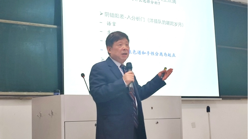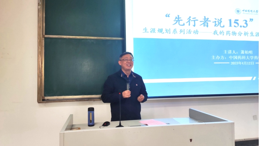 萧柏明博士以“我的药物分析生涯点滴”为题,回忆了从童年到插队,从进入南药到从事药学工作的黄金岁月,分享了人生故事与心路历程,讲述了药物分析职业人生点滴。他以年少时的意气风发和海外求学时的艰辛时光,激励同学们要有跳出舒适圈、勇于挑战的精神;通过对NDA前解决物料缺失难题、不稳定降解物(鬼峰)的来龙去脉及动力学研究、片剂物料缺失案例分析DoE、液相色谱技术探索及其特点等案例的讲述,展示了从勤奋加蛮干到质量源于设计研发理念的发展与进步,以及多学科知识交叉融合对于解决难题的重要性,鼓励同学们坚定信心,勇于探索。萧柏明博士回首过去,立足当下,鼓励同学们寻找属于自己的人生路,坚定信仰,诚挚热爱,做好每一件事。