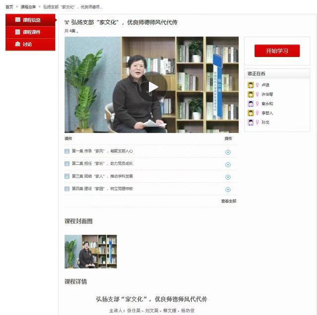 4月13日,药公司党委书记张仕英及药物分析系教师党支部历届三任党支部书记刘文英、柳文媛、杨功俊主讲的《弘扬支部“家文化”,优良师德师风代代传》课程上线。该课程分为“传承家风,凝聚支部人心”“担任家长,助力党员成长”“团结家人,推动学科发展”“建设家园,树立党建样板”四集,以访谈的形式讲述药物分析系教工党支部传承支部“家文化”的举措及经验。此外,由公司药公司党委书记张仕英主讲的《坚持五个到位,以高质量党建引领高质量发展——伟德国际1946亚洲版药公司党委创建全国党建标杆院系的思考》课程也已上线。该课程讲述了公司药公司党委在党建工作标杆院系培育创建中的经验和体会。