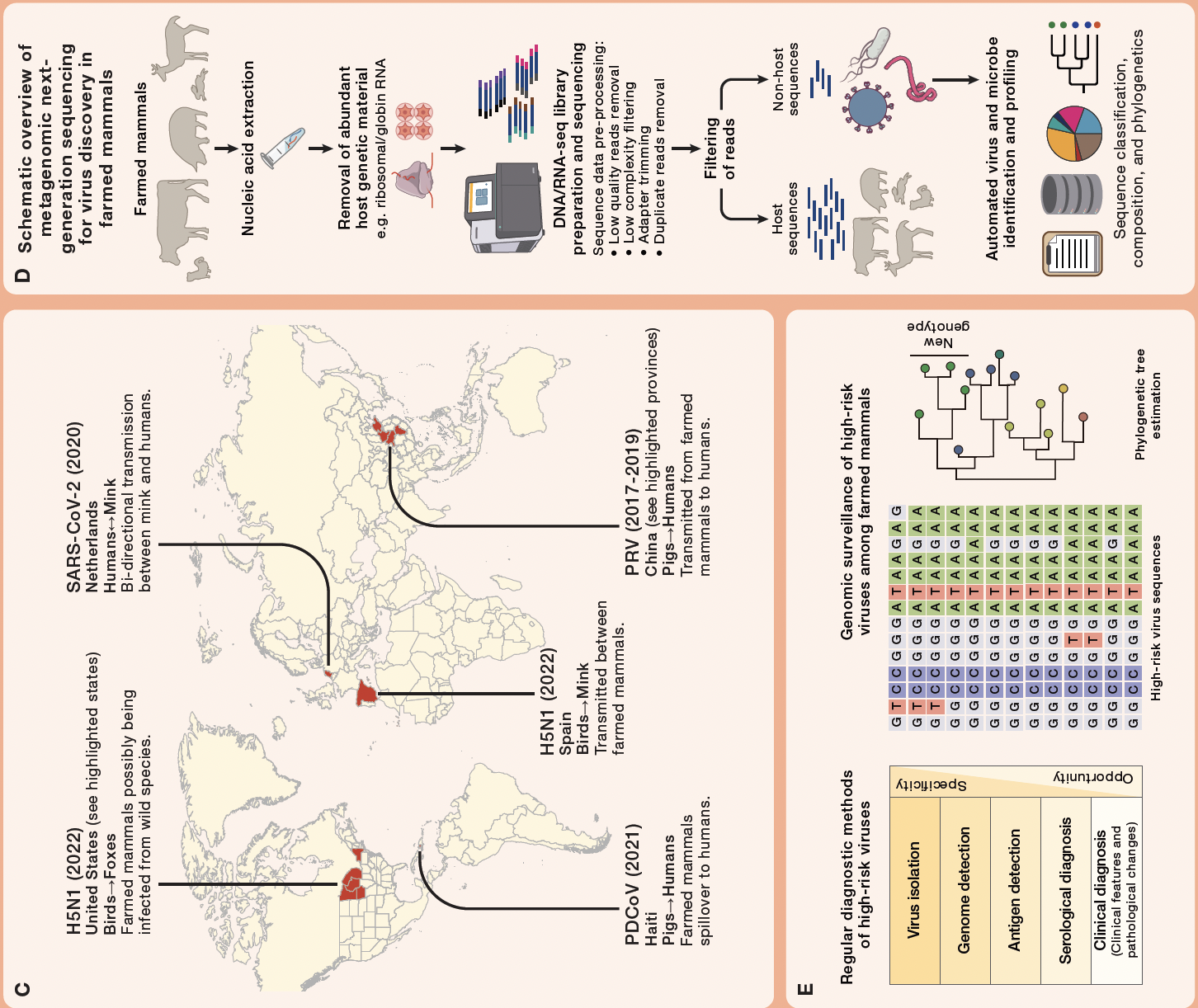 本论文系统分析和总结了与人密切接触的养殖哺乳动物携带病毒的多样性及其在动物间以及动物和人之间的跨宿主传播风险,并提出了针对禽流感病毒(人兽共患)和盖塔病毒等风险病毒的前沿监测方法和防控建议。
