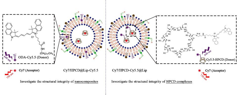 研究顺应性好、无创伤、能够自主给药的眼部制剂至今仍然是药剂学者最具挑战的领域之一。本研究以地塞米松为模型药物,缬氨酰缬氨酸为靶头,构建了主动靶向型羟丙-β-环糊精@脂质体双载体递药系统,并对纳米载体在从眼表到眼后段各个组织中的完整性进行实时动态监控以探索其体内转运命运。课题组在前期对载体完整性研究的基础上 (Acta Biomater. 2022, 141, 164-177. IF: 10.633),以近红外 Ⅰ 区菁染料Cy5.5/Cy7为FRET对,结合FRET技术与小动物活体成像仪比较了双载体纳米复合物与单载体脂质体在体内外转运过程中的完整性。本研究还将Cy5.5修饰在羟丙-β-环糊精表面,首次考察了环糊精包合物在跨结膜上皮单层细胞后的完整性以及在家兔眼组织转运过程的完整性。