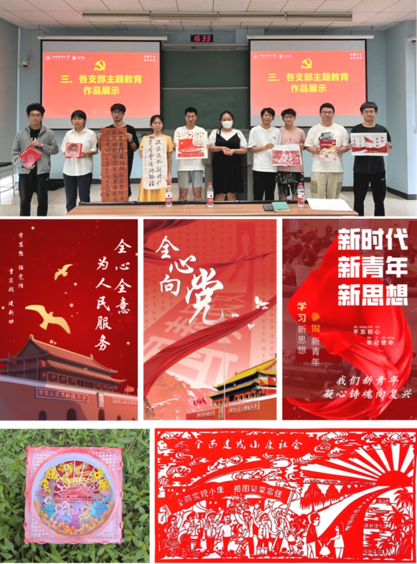 此外,为充分认识主题教育的重大意义,准确领会把握党的主题教育的思想精髓和核心要义,推动习近平新时代中国特色社会主义思想入脑入心。2022级本科生入党积极分子通过视(音)频和美术作品“创作育人”,切实做到“用心学进去,用情画出来,用力做起来”。将主题教育融入到作品创作中,通过作品制作表达自己对主题教育的理解。党支部入党积极分子以小组为单位精心制作了包括书法、剪纸、雕刻、手工、朗诵、歌曲等多种类型的作品,在创作的过程中边学边悟,用直观生动的艺术形式传达党的思想理论。