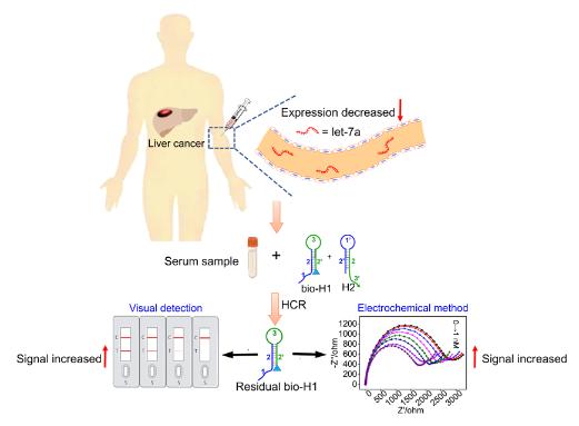 Let-7a是一类在肿瘤细胞中低表达的miRNAs,被认为是一种潜在的肿瘤抑制生物标志物和治疗靶点。因此,建立简便且灵敏的let-7a检测方法对肿瘤的诊断和治疗具有重要意义。在本工作中,以 let-7a 作为靶标设计了一对发夹引物 H1(5’端修饰生物素,bio-H1)和 H2,let-7a 可以与 bio-H1 碱基互补从而引发杂交链式反应(Hybridization chain reaction,HCR)。之后,分别采用侧流层析试纸条(Lateral flow assay,LFA)和阻抗型电化学(Electrochemical impedance spectroscopy,EIS)技术检测剩余的bio-H1,间接实现对let-7a的分析。在LFA方法中,检测时间少于1 h,实现了对let-7a的快速可视化检测;在电化学方法中,在10 fM和1.0 nM范围内呈现良好线性且检出限低至4.2 fM,实现了对let-7a的高灵敏检测。综上,该研究提出使用剩余引物法间接检测let-7a,为miRNAs的检测提供了一种新的思路。