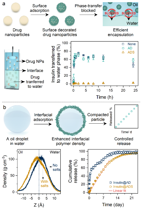 刘东飞团队将结构及性质多样的药物分子转换为胶体颗粒作为包载的基本单元,通过提高聚合物载体材料在药物胶体颗粒表面和油水界面的分布,制备具有功能基元序构特点的微球,实现多肽蛋白类药物的高效包载和可控释放。聚合物在药物胶体颗粒表面的吸附,有效改善两者相容性,阻断药物从油相到水相的转移,实现高达99.9%的包封效率。通过水相中盐的引入,增强聚合物载体材料在油水界面的分布,在微球表面形成致密聚合物层,实现药物接近零级的释放动力学。结合分子动力学模拟等手段,初步探究了聚合物分子界面分布对药物包封、微球结构与尺寸、药物释放的调控机制。利用自主开发的连续流装置(专利号CN202111465267)精准控制微球制备过程,有效降低批次间差异。