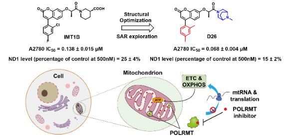 团队以Nature上发表的首个POLRMT抑制剂IMT1B为先导物,采用基于配体结构改造的策略,开展了以活性为导向的系统构效关系探究,发现了一个强效化合物D22,进一步优化其PK研究得到优选化合物D26。化合物D26可剂量依赖性地下调A2780细胞线粒体转录水平,且在撤药后能较快恢复转录水平,表明D26对线粒体转录的抑制为一种药物依赖性且可逆的过程。并且,化合物D26在高浓度下对正常细胞无明显细胞毒作用。动物实验显示,口服给药化合物D26显著抑制A2780异种移植瘤的生长,药效优于IMT1B。此前研究显示IMT1B在长期体内给药后会轻微抑制肝细胞线粒体转录,而D26克服了IMT1B这一缺陷,只对肿瘤组织线粒体转录产生影响,对心肌与肝脏组织线粒体转录无影响。因此,相较先导化合物IMT1B,化合物D26具有更优的药效与更好的安全性。优选化合物D26具有作为新型抗肿瘤候选药物进一步开发的潜力,该研究为POLRMT抑制剂的开发提供了的新思路与参考。