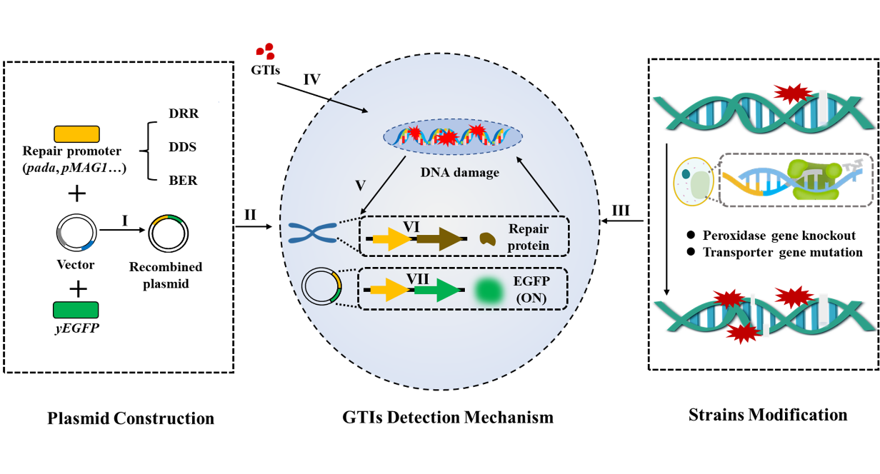 团队长期致力于构建遗传毒性杂质(GTIs)的可靠、灵敏和高通量评价体系,为保障药物安全性提供技术支持。前期,已基于GTIs诱导的胞内共性效应蛋白γH2AX构建了金纳米免疫型SERS肝细胞传感器用于GTIs的快速筛查(Analytical Chemistry, 2023,95(15):6312-6322.)。为进一步揭示GTIs的损伤修复机制、提升检测通量和灵敏度,本研究依据GTIs引起DNA损伤修复的原理,将不同修复途径(碱基切除修复、直接逆向修复等)的启动子作为传感元件、增强型绿色荧光蛋白基因(yEGFP)作为报告元件构建质粒,将其导入大肠杆菌和酿酒酵母中,并通过基因编辑手段改造菌株的过氧化物酶和膜转运蛋白基因,放大菌株的遗传毒性响应。构建的工程化全细胞微生物荧光传感器可在微孔板中对GTIs进行高通量筛选和毒理机制预测,助力微量药物杂质的遗传毒性快速评价。