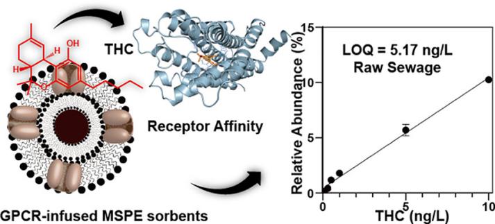 近年来,狄斌团队围绕环境样品中痕量精神活性物质的定量分析开展了大量研究工作。本研究在前期工作基础上,建立了一种全新的策略,利用GPCR受体包被技术将传统磁富集的物理吸附升级为高特异性的生物识别,从而大大提高了前处理方法效能以及后续液质分析的灵敏度。课题组提出了受体亲和性磁固相萃取技术,采用包被高表达GPCR细胞膜的磁性脂质体作为吸附剂,制备修饰有CB1大麻素受体的新型吸附剂CM@Lip@Fe,实现复杂污水基质中特异性提取和富集THC的目的。基于CM@Lip@Fe配体-受体相互作用的高亲和力和分子选择性,其与HPLC-MS/MS联用在未经处理的污水中取得了5.17ng/L的定量限。方法优势包括无需有机溶剂,灵敏度较传统液液萃取提高了5倍,吸附剂用量低(75mg/L污水)和高效性。