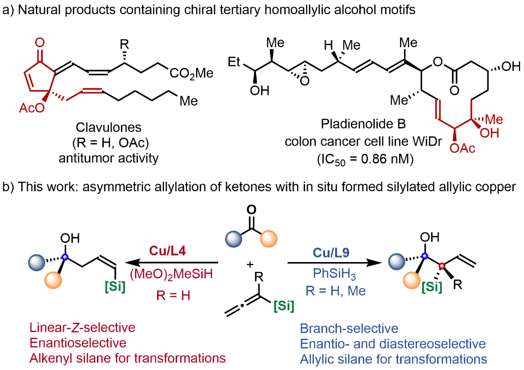 近年来,姚和权/高尚团队针对具有重要生物活性药物分子片段和砌块,通过过渡金属催化氢官能化等策略,设计合成了多类手性分子骨架,取得多项重要研究成果(J. Am. Chem. Soc.2022, 144, 11364–11376;Angew. Chem. Int. Ed.2023, 62, e202305518)。在此基础上,近日,该团队针对聚酮类天然产物的优势骨架之一,即手性高烯丙基叔醇骨架,设计开发了一类以酮为原料,廉价金属铜催化的对映选择性和区域发散性烯丙基加成反应。该研究通过不同手性配体的使用,分别实现了支链高烯丙基叔醇以及直链Z-式高烯丙基叔醇的高区域选择性及对映选择性合成。此外,通过钯催化双键异构化策略,直链Z-式高烯丙基叔醇可顺利转化为直链E-式高烯丙基叔醇。产物中烯基硅烷或烯丙基硅烷片段可以直接参与各类转化反应,快速、高效地丰富产物的结构多样性。