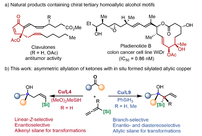 聚酮类天然产物是微生物天然产物的重要组成部分,具有广泛的药用价值和重要的生理功能。此类化合物往往包含着大量手性高烯丙基叔醇骨架,存在多个手性中心以及Z/E-构型多样的烯烃片段,使得围绕其进行的药物研发工作极具挑战性。另一方面,手性药物分子的立体构型对于生物活性有着极为重要的影响,不同的立体异构体生物活性差异显著,甚至具有完全不同的药理活性。团队针对手性高烯丙基叔醇骨架,设计开发了一类以酮为原料,铜催化不对称烯丙基加成反应。通过不同手性配体的使用,分别实现了支链、直链Z-式高烯丙基叔醇的高区域选择性及对映选择性合成。产物中烯基硅烷或烯丙基硅烷片段可以直接参与各类转化反应,快速、高效地丰富产物的结构多样性。