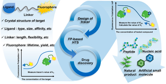 基于竞争性结合的荧光偏振(FP)测定法,是测量小分子结合亲和力的一种有效且成熟的工具。该方法既适用于药物发现中潜在化合物的高通量筛选(HTS),也适用于深入的候选化合物构效关系(SARs)研究。研究团队简要地介绍FP技术地基本理论和工作流程,然后从药物化学的角度重点介绍了典型 FP 探针分子的设计和应用。团队根据近年来的成功案例总结了不同类型探针分子的设计方法,并根据探针分子中配体的不同,对这些探针进行了分类,包括多肽、核酸、天然产物和小分子。该综述全面阐了FP技术在药物研发中的重要意义以及技术要点——探针分子的设计方法,进一步促进该技术在药物开发中的应用。