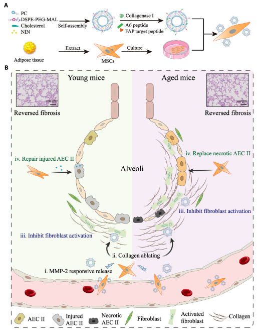肺纤维化(PF)是一种发病率和死亡率显著且与年龄相关的间质性肺病,FDA批准的药物可以减缓PF的进展,但由于药物的积累不足和II型肺泡上皮细胞(AEC II)的广泛坏死,治疗患有严重纤维化的老年患者是无效的。研究团队通过将间充质干细胞与负载尼达尼布的I型胶原酶修饰脂质体进行生物偶联,构建了一个基于间充质干细胞(MSC)的纳米工程平台(MSCs-Lip@NCAF)用于治疗严重的纤维化。MSCs能使MSCs-Lip@NCAF显著靶向聚集于纤维化肺,然后Lip@NCAF被释放。随后Lip@NCAF消融胶原纤维,将尼达尼布输送到成纤维细胞中,并抑制成纤维细胞的过度激活。MSCs分化为AEC II以修复肺泡结构,并最终促进衰老小鼠受损肺部的再生。该研究结果表明MSCs-Lip@NCAF可作为PF治疗的有前景的候选治疗药物,尤其是在老年患者中。