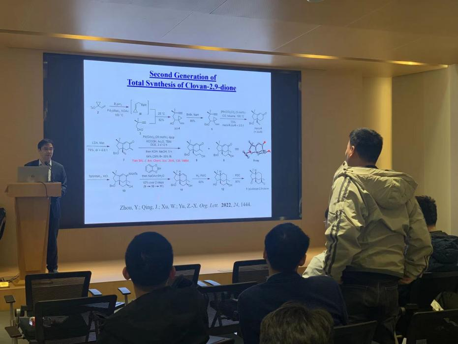报告中,余志祥教授介绍了课题组发展的[5+2+1], [7+1], [4+2+1], [5+2], [4+3], [3+2+1], [4+2], [5+1], [3+2], [4+1]等一系列成环反应,并将其中的一些反应应用于天然产物的合成。利用计算化学为主要手段研究反应机理,然后基于机理设计新反应,并通过实验进行验证和发展。提问环节中,伟德国际victor1946杨鹏教授、林爱俊教授、高尚教授以及与会员工都与余教授进行了课题问题的探讨。余教授与在场师生积极互动,耐心细致地答疑,公司师生们均获益匪浅。