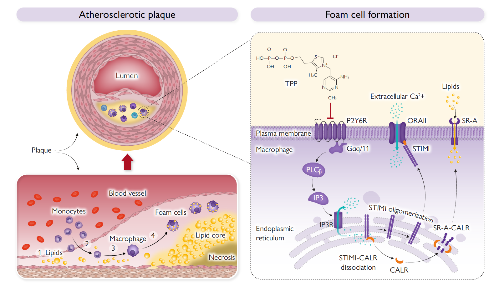 本项研究揭示了动脉粥样硬化中的新病机。研究人员基于临床样本、动脉粥样硬化动物模型发现P2Y6R在动脉粥样硬化病程中高表达,通过单细胞测序数据分析发现高表达的P2Y6R主要定位于巨噬细胞中。进一步构建了巨噬细胞特异性P2Y6R敲除小鼠,12周高脂饮食喂养后发现:与对照组小鼠相比,巨噬细胞P2Y6R敲除的小鼠中主动脉斑块明显减少。通过转录组学测序、pull down实验、蛋白组学等实验方法揭示了P2Y6R参与动脉粥样硬化的深层机制,P2Y6R通过激活PLCβ/SOCE/CALR介导的钙离子信号,引起清道夫受体SR-A表达的上调,从而加速脂质摄取导致巨噬细胞泡沫化。