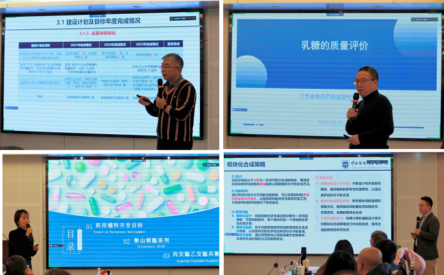 随后,孙春萌教授作重点实验室工作报告,详细介绍了重点实验室2023年建设情况及三年期建设目标完成情况;江苏省食品药品检验监督研究院检验技术研究室主任袁耀佐、南京威尔药业集团研究院(江苏省水溶性药用辅料工程技术研究中心)副经理王娅、伟德国际1946亚洲版药剂系副教授何东升分别就各单位研究进展进行主题报告。